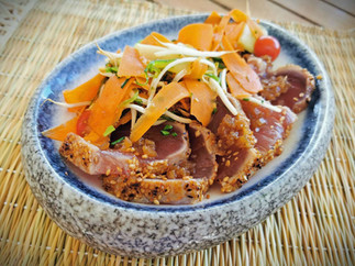 Son credo: le fait maison en première fraîcheur. Le terroir et la pêche locale sont ses sources d’inspiration. Au programme du jour, de délicieuses mises en bouche, ceviche de daurade royale aux agrumes, bœuf de Simmental au Wasabi, focaccia pissaladière gratinée d’un parmesan dix-huit mois et croustille d’une rouille césar à la poutargue fumée. La surprise du chef : une gambas rôtie, fraîcheur d’avocat au combawa et Yuzu, coulis de poivron jaune fumé. On continue avec des tomates multicolores de la maison Campana, arrosées de pistou, burratina des Pouilles, un tataki de thon relevé d’un condiment gingembre et des calamars à la provençale, purée de pommes de terre au basilic, huile vierge.